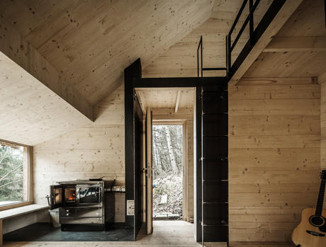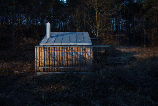 Dieses schlichte Haus nimmt starken Bezug auf seine Umgebung, folgt der Kontur eines verfallenden Vorgängerbaus und wurde regelrecht um einen Menschen und seine Leidenschaften herum gezeichnet. Eine kantige Raumform umschließt auf zwei Niveaus das Leben in diesem Rückzugsort. Ganz verschlossen mit allseitigen Läden läßt sich die Hütte zu unterschiedlichen Ausblicken öffnen. Vorgefertigt aus Holz findet sich alles Notwendige auf engstem Raum. Eine markante bauliche Identität wird zum Partner, zum Ort des Rückzugs, aber auch der Gastlichkeit und der persönlichen Weiterentwicklung. Ankommen, Schutz suchen, ausruhen, sich nähren und Gleichklang finden. Dann der Blick hinaus. Vision.